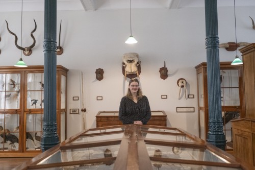 [font=Bembo]Seit den 1970er Jahren gibt das Naturalienkabinett so eine Vorstellung davon, wie das Großherzogliche Naturalien-Cabinett in Zeiten der Museumsgründung ausgesehen haben könnte. Aus heutiger Sicht wirft dieser Raum allerdings Fragen auf: wo kommen die Objekte her? Wie kamen sie in den Besitz des Museums? Und bietet die Art dieser Ausstellung genug Raum für eine kritische Auseinandersetzung? Denn neben Pflanzen- und Tierpräparaten sowie Mineralien und Fossilien aus verschiedensten Herkunftsländern befanden sich auch ethnologische Objekte in der Sammlung, welche mittlerweile aus der Ausstellung entfernt wurden. Das Thema Provenienzforschung gewinnt seit Jahren zunehmend an Bedeutung, sodass sich in diesem Jahr eine neue Arbeitsgruppe formierte, die sich mit kolonialen Kontexten der Sammlung des Naturalienkabinetts auseinandersetzt. Zu den entfernten Objekten gehören beispielsweise Speere und Schilde der Massai. Dazu erklärt die Provenienzforscherin Jennifer Tadge: „Wir haben dazu geforscht, wie der Sammler an diese Objekte gekommen ist und konnten ganz klar feststellen, dass[/font][font=Bembo] [/font][font=Bembo]es sich um Gewaltkontexte handelt. Er hat diese Objekte auf dem Schlachtfeld aufgesammelt, nachdem die Menschen diese bei der Flucht haben fallen lassen. Hier hingen diese nun unkontextualisiert an der Wand und wir wissen als Museum schon länger, dass das problematisch ist.“[/font][font=Bembo] [/font]