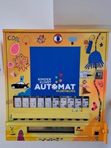In dem KinderKunstAutomaten befinden sich kleine, handgefertigte Unikate, die von Kindern für Kinder kreiert wurden und für nur 2€ mitgenommen werden können. Die jungen, kreativen Erfinder wurden dabei von dem freischaffenden Künstler & Dozenten der Oldenburger Kunstschule Timo Willen an die Hand genommen. Das Modellprojekt des Kulturbüros soll die Kreativität der Kinder fördern, ihnen handfeste Möglichkeiten zur Umsetzung ihrer Ideen liefern und dies spielerisch mit kultureller Bildung und Teilhabe verknüpfen. Seit der 50. KIBUM im November 2024 steht der Automat dort und erhält regelmäßig neue kleine Kunstwerke. Derzeit befinden sich dort einige individuelle Umsetzungen in vier Kunstformen. Welche der Käufer dabei erhält ist dem Zufall überlassen.