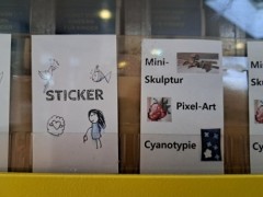 Zuerst die „Sticker“-Boxen, die schon seit 2024 Abnehmer finden. Mit visuellen Notizen wurde hier das Thema Frieden in einer Kombination aus Text und Zeichnungen umgesetzt. Bei den neuen „Cyanotypien“ handelt es sich um Fotogramme, also Schattenbilder von Objekten, die sich mit einer speziellen Technik von einem blauen Hintergrund abheben. Eine andere Kunstform ist die „Pixel Art“, in der auf kleinen, selbstklebenden Notizzetteln Bilder in Rastergrafiken gemalt sind. Für beide Kunstformen befinden sich auch kurze Anleitungen in den Boxen. In der letzten Kategorie Box befinden sich vergoldete „Mini-Skulpturen“, die hauptsächlich aus Krimskrams zusammengestellt wurden.