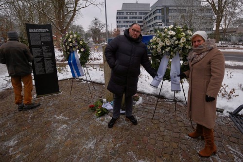 Am 27. Januar jährte sich der Befreiungstag des Konzentrationslager Auschwitz zum 81. Mal. Im Zuge dessen legten Bürgermeisterin Christine Wolff und Patrick Schwarz, Vorsitzender des Freundeskreises für Sinti und Roma, Kränze am Mahnmal für Sinti und Roma (Friedhofsweg/ Ecke Jägerstraße) nieder. 74 Mitglieder von Sinti-Familien wurden 1943 aus Oldenburg deportiert und kamen schließlich ums Leben. Das Mahnmal wurde 2025 um eine Erinnerungstafel, die die Namen der Opfer sowie Geburts- und Sterbedaten beinhaltet. Bild: Stadt Oldenburg